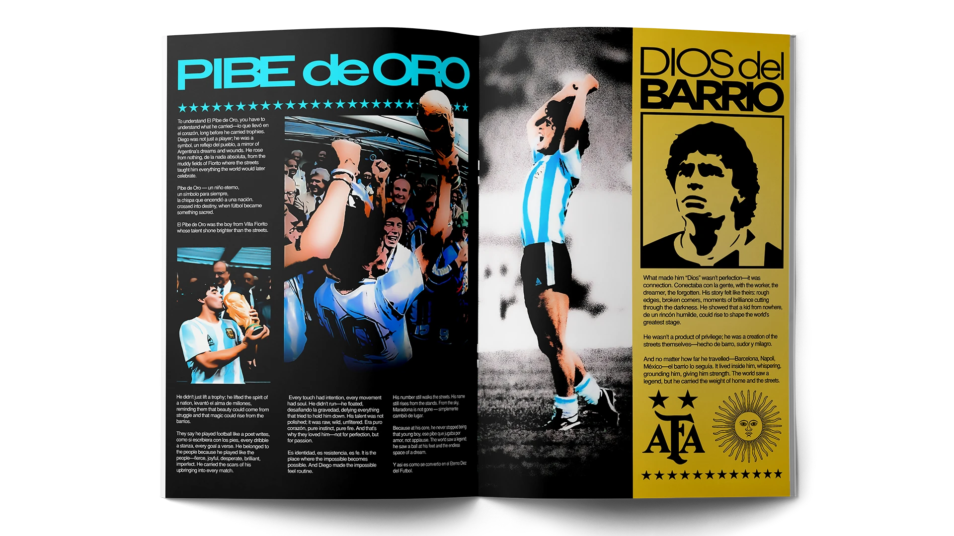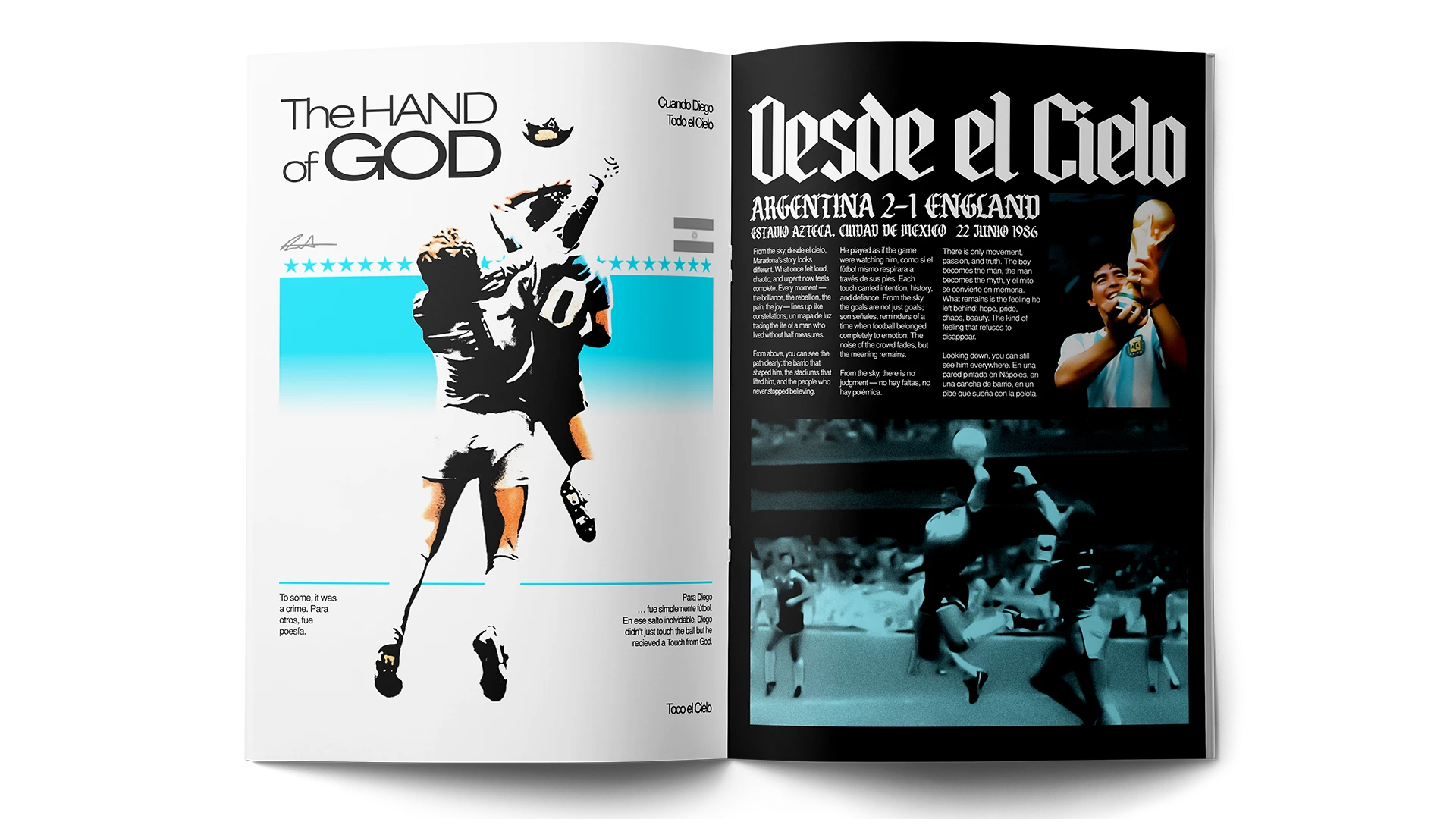 I approached the magazine as a tribute to Diego Maradona creating pages that feel distinct while still belonging to one system. The cover references religious iconography reinforcing the project’s homage and tribute tone.